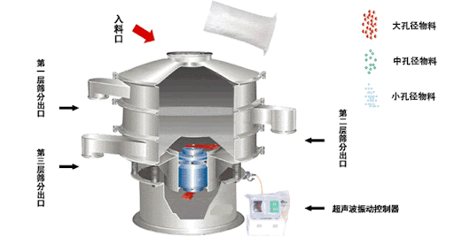 中药超细粉超声波振动筛是通过安装1-5层不同目数的筛网来实现中药超细粉从粗到细粉的筛分的,电机会产生水平,垂直,倾斜的三次元运动,而同时超声波发生器产生18-40kHz 高频电能,通过换能器转化为机械振动,并传递给传递至筛网表面,中药超细粉就在机械振动 + 超声波振动的两种作用下,可以打破超细粉颗粒间的表面张力、、静电吸附等导致的团聚现象从而实现物料2-6种不同大小规格的筛分。